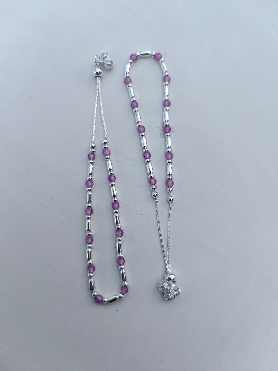 A delicate silver anklet adorned with soft purple beads, offering an elegant and graceful look.