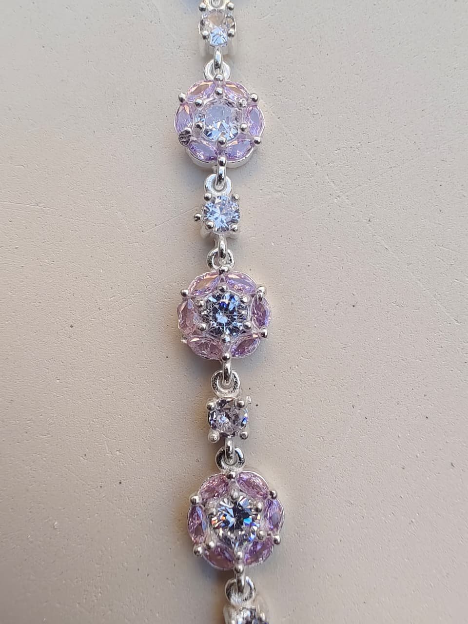 A graceful silver anklet featuring soft pink stones arranged in a floral-inspired pattern.